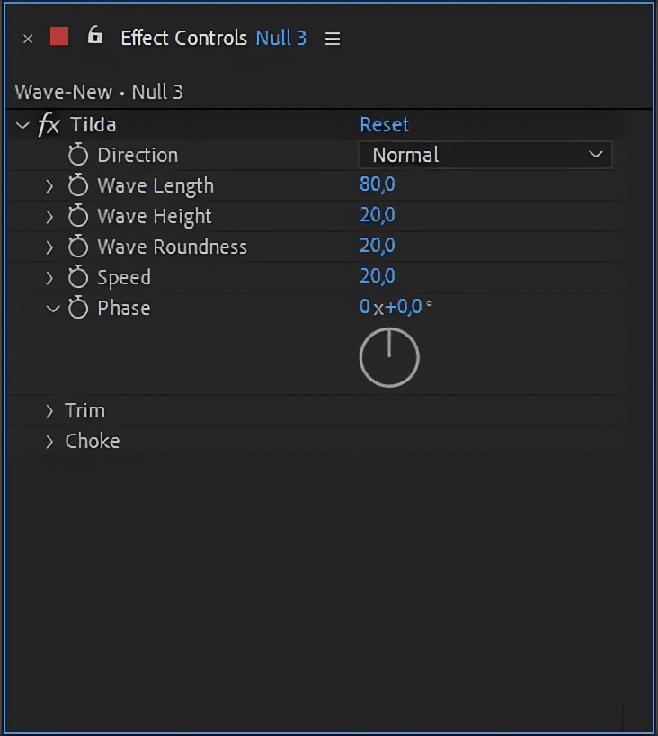 At its core, Tilda is just one (huge) expression and a controller effect. Just select a shape and press the «Waves» button. Your shape will be turned into waves and you'll be able to control lots of its different parameters, like width, height, speed, etc. Watch the video below for some basic examples.